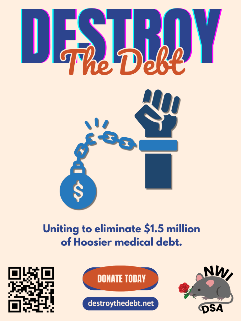Here’s how it works – Undue Medical Debt has pre-allocated the purchase of roughly $1.5 million in medical debt for $15,000. This debt is owed by residents of Lake, Porter, Laporte, and Saint Joseph Counties. Upon NWI-DSA raising the funds, Undue will purchase and then immediately forgive all debts owed. Those no longer in debt will receive letters in the mail explaining that their debts are forgiven and how we accomplished it.